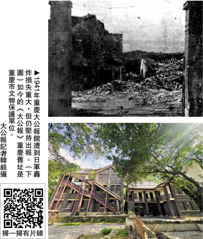 图:1941年重庆大公报馆遭到日军轰炸损失重大,但仍坚持出报。(下图)如今的《大公报》重庆旧址是重庆市文物保护单位。\大公报记者韩毅摄