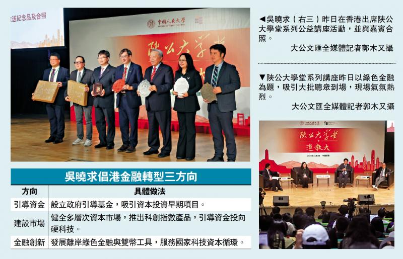 左图:吴晓求(右三)昨日在香港出席陕公大学堂系列公益讲座活动,并与嘉宾合照。右图:陕公大学堂系列讲座昨日以绿色金融为题,吸引大批听众到场,现场气氛热烈。\大公文汇全媒体记者郭木又摄