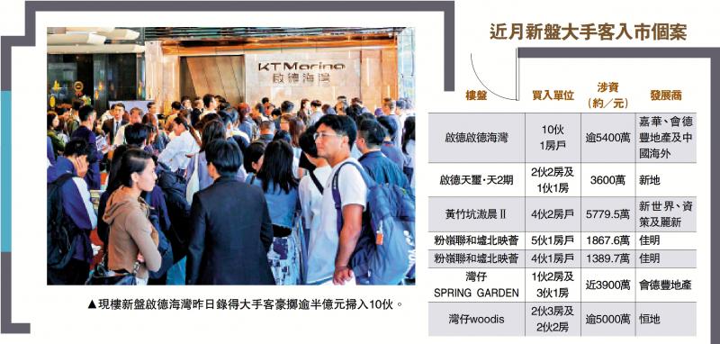 本港银行两度减息后,楼市“供平过租”愈加明显,现楼新盘频录投资者大举扫货,嘉华国际(00173)牵头的启德跑道区项目启德海湾,昨日新一轮发售108伙,全日共卖73伙,最大手买家豪掷逾半亿元购入10伙1房单位。受惠销情升温,本月一手成交突破900宗,按月增加逾两成。\大公报记者 林惠芳