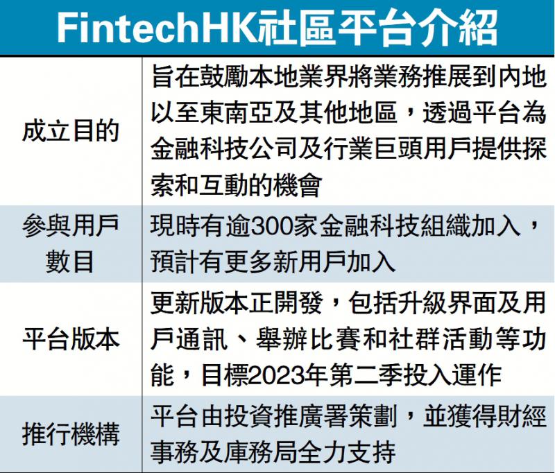 FintechHK社区平台的更新版本正在开发中,预期完成更新后,将包括升级界面及用户通讯、举办比赛和社群活动等功能。新版本预计于2023年第二季投入运作,以支持全球Fast Track计划2023及其他连接潜在商业交易及融资机会的计划。
