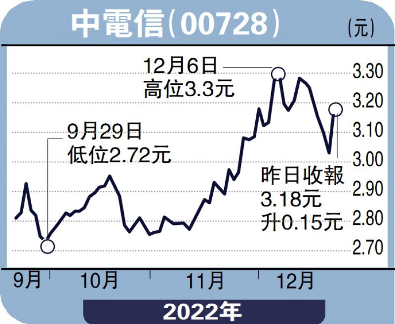 中电信昨日靠北水“扫货”,带动股价收报3.18港元,大涨近5%,跑赢大市,更跑赢中移动(00941)及联通(00762),中电信短期上望目标价3.3元。