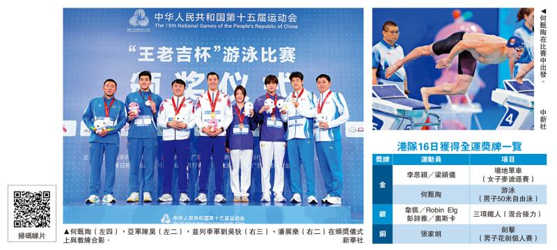 16日,香港代表团在第15届全运会捷报频传。继李思颖/梁颖仪于下午上演的场地单车女子麦迪逊赛夺金后,28岁的何甄陶于晚上举行的男子50米自由泳以破香港纪录的21秒71力压群雄,除个人首摘全运会金牌外,亦助港团取得在全运会史上首枚男子游泳项目金牌。同日,港团亦获得三项铁人混合接力赛银牌及张家朗的男子花剑个人赛铜牌,截至昨日,暂获竞赛项目7金2银5铜,继续创造参与全运会以来的单届纪录。\大公报记者 石华、李望贤深圳报道
