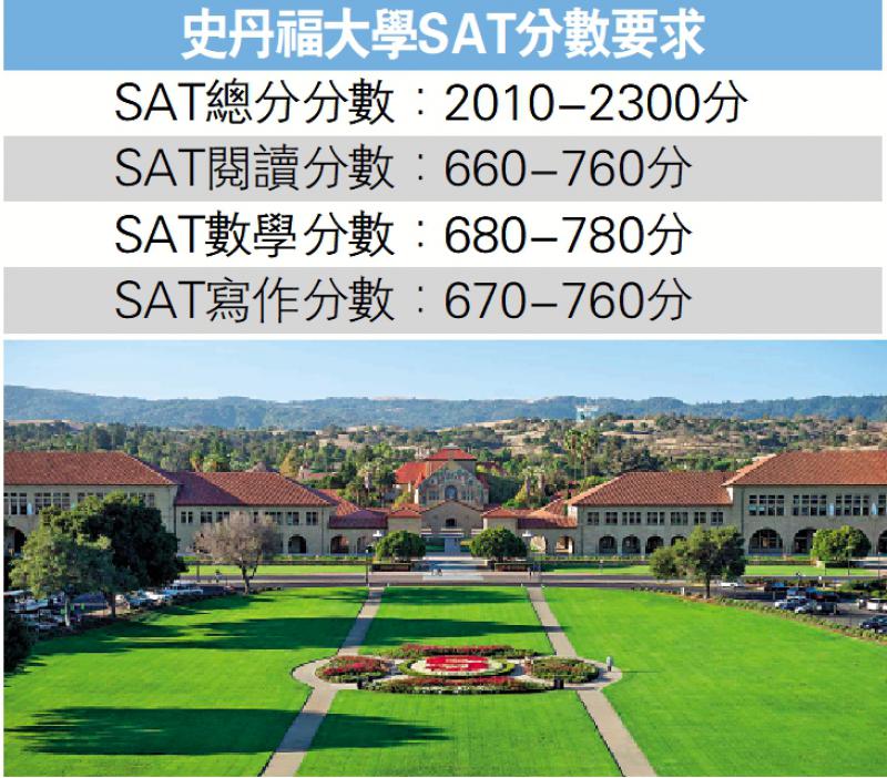 史丹福大学的学校官方网站上明确标明,要求考生给予SAT或美国大学入学考试(ACT)加写作的成绩。学校要求参加至少两门的SAT2考试。假如参加SAT2数学,建议考生参加Level2。该校亦建议考生提交托福成绩,而有关考试亦可于网上进行,三个考试都可以在香港应考。