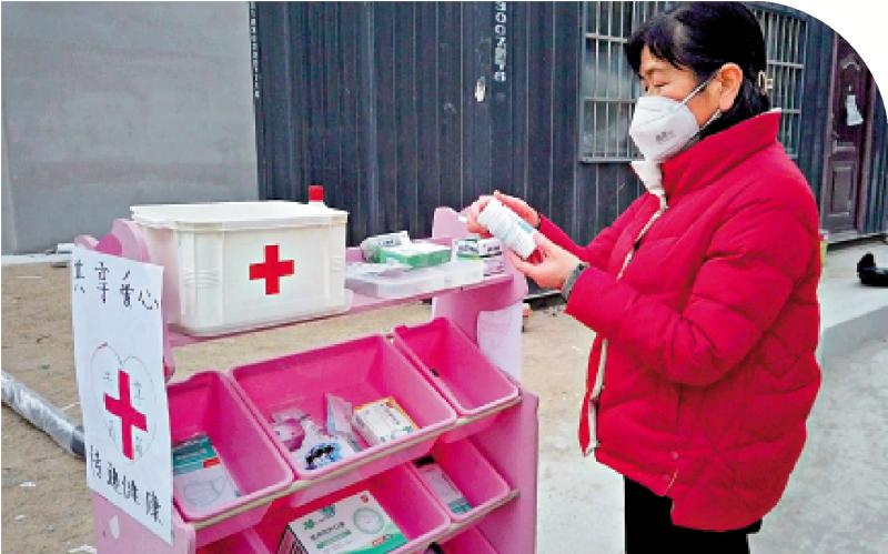 图:一位邻居在崔京军设置的“共享药箱”前选择药品。/受访者供图