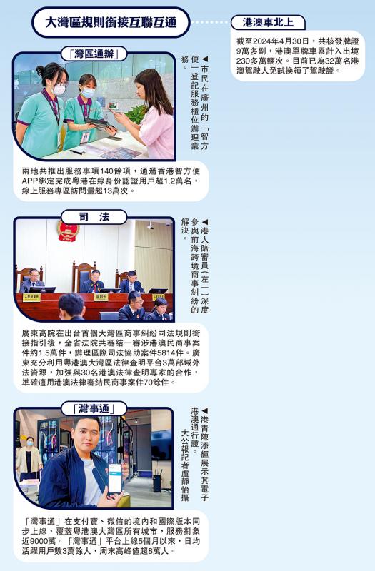 广东高院在出台首个大湾区商事纠纷司法规则衔接指引后,全省法院共审结一审涉港澳民商事案件约1.5万件,办理区际司法协助案件5814件。广东充分利用粤港澳大湾区法律查明平台3万部域外法资源,加强与30名港澳法律查明专家的合作,准确适用港澳法律审结民商事案件70余件。