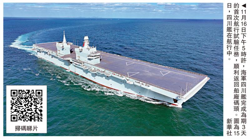 【大公报讯】据新华社报道:16日下午5时许,海军四川舰完成为期3天的首次航行试验任务,顺利返回船厂码头。
