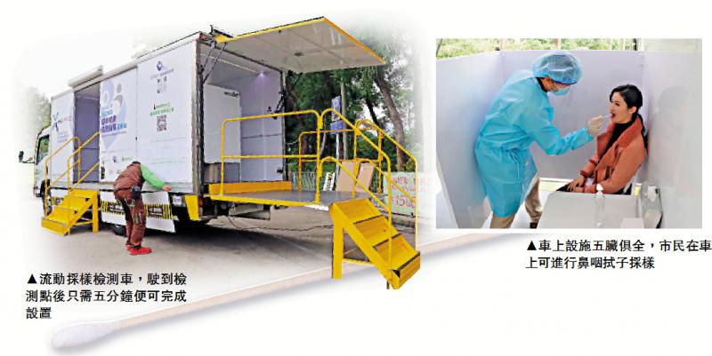 【大公报讯】记者伍轩沛报道:新冠肺炎第四波大爆发,全港检测需求殷切,有检测机构夥拍物流与医疗机构,推出亚洲首部流动採样检测车,车上设施五脏俱全,驶到检测点后只需五分鐘,便可在车上为市民进行鼻咽拭子採样检测。彩云邨明丽楼爆疫,检测车在强制检测首日已到达服务,为近800名居民採样。营运机构研究,流动检测车可否变身流动疫苗注射车。