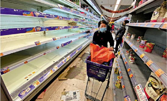 有市民坦言“人抢我又抢”,因担心未来几日食品供应不足,故选购可以存放多日的食品,以备不时之需。