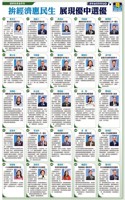 26号候选人曾志文提出“十大承诺”,涵盖经济、民生、文化、长者、青年、妇女等多个范畴。她希望推动建立一个集科技、金融、文创于一体的综合服务平台,为港企提供政策咨询、项目配对及专业指导,实现区域资源高效对接,创造新商机;推动生活福利跨境,实现湾区生活便利无忧;扩大法律、建筑、医疗等专业资格互认,共建大湾区人才库。