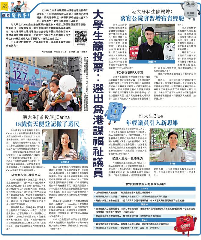 港大学生Carina是立法会选举的首投族,她指大湾区发展蓝图已启动,需要选出一班学识广博、眼光辽阔的立法会议员为香港谋福祉;港大牙科学生陈锡坤指立法会修订牙医注册条例草案,落实基层医疗健康蓝图,立法会工作与民生息息相关;恒大学生Blue乐见候选人多了新面孔,增添立法会活力。