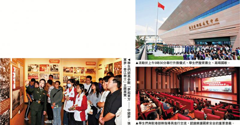 左图:学生们认真参观“梦起东方 ── 中国梦.强军梦.香江卫士”主题展览。右上图:活动于上午9时30分举行升旗仪式,学生们整齐肃立、高唱国歌。右下图:学生们与驻港部队指导员进行交流,认识维护国家安全的重要意义。