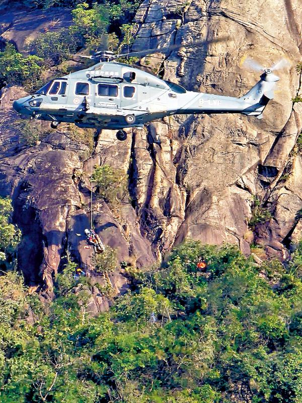 图:失踪中年汉堕崖身亡,政府飞行服务队将事主遗体吊起送走。