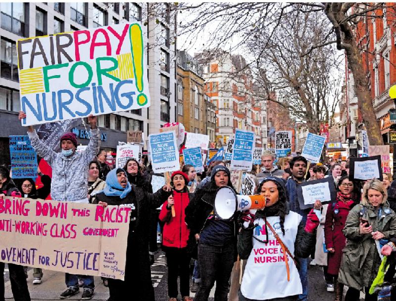 图:NHS护士20日在伦敦罢工,要求政府提高薪资。\路透社