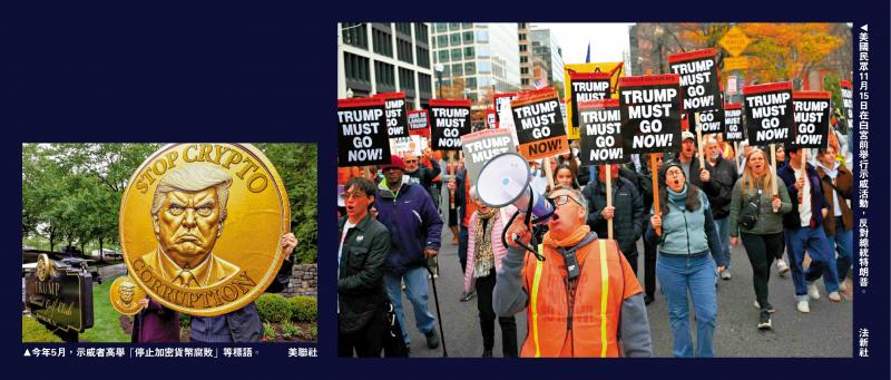 左图:今年5月,示威者高举“停止加密货币腐败”等标语。\美联社;右图:美国民众11月15日在白宫前举行示威活动,反对总统特朗普。\法新社