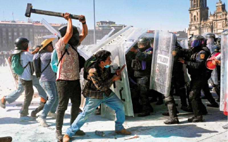图:墨西哥大批示威者15日在首都墨西哥城街头抗议,其间与警方发生冲突。\美联社