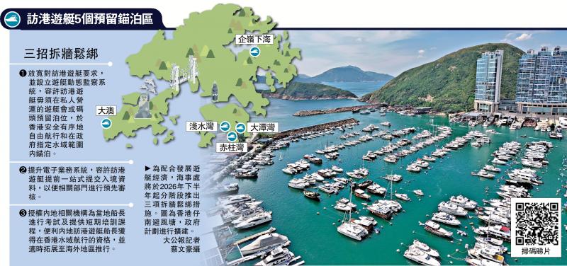 落实拆墙松绑措施后,访港游艇毋须在游艇会或码头预留泊位,亦可在香港自由航行及在政府指定水域停泊。王世发表示,海事处已预留了五个地方作为游艇锚泊区,分别是赤柱湾、大潭湾、浅水湾、大澳和企岭下海。若以40米长的游艇为例,该五个湾区共可停泊约110艘游艇。