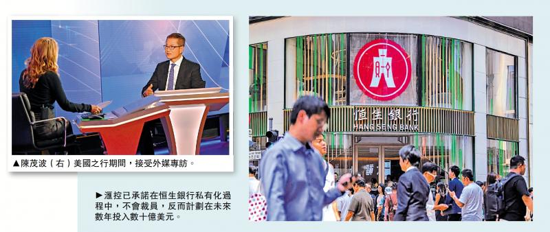 左图:陈茂波(右)美国之行期间,接受外媒专访。右图:滙控已承诺在恒生银行私有化过程中,不会裁员,反而计划在未来数年投入数十亿美元。