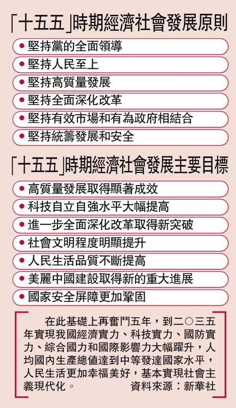 在此基础上再奋斗五年,到二○三五年实现我国经济实力、科技实力、国防实力、综合国力和国际影响力大幅跃升,人均国内生产总值达到中等发达国家水平,人民生活更加幸福美好,基本实现社会主义现代化。 资料来源:新华社