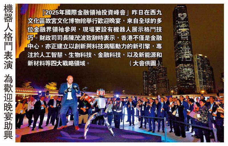 “2025年国际金融领袖投资峰会”昨日在西九文化区故宫文化博物馆举行欢迎晚宴,来自全球的多位金融界领袖参与,现场更设有机器人展示格斗技巧。财政司司长陈茂波致辞时表示,香港不仅是金融中心,亦正建立以创新与科技为驱动力的新引擎,专注于人工智慧、生物科技、金融科技,以及新能源和新材料等四大战略领域。(大会供图)