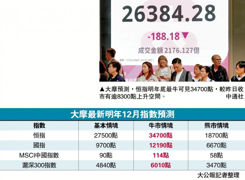 大摩预期,恒指2026年底在基本情境目标为27500点,若果在牛市情境下,指数可达34700点,即较恒指昨日收市价26384点,约有8316点上升空间,并且创出历史新高。若果遇到熊市情境,恒指有可能要见18700点。国企指数的基本情景目标9700点,牛市目标12190点,而熊市目标为6670点。国企指数昨日收报9328点。