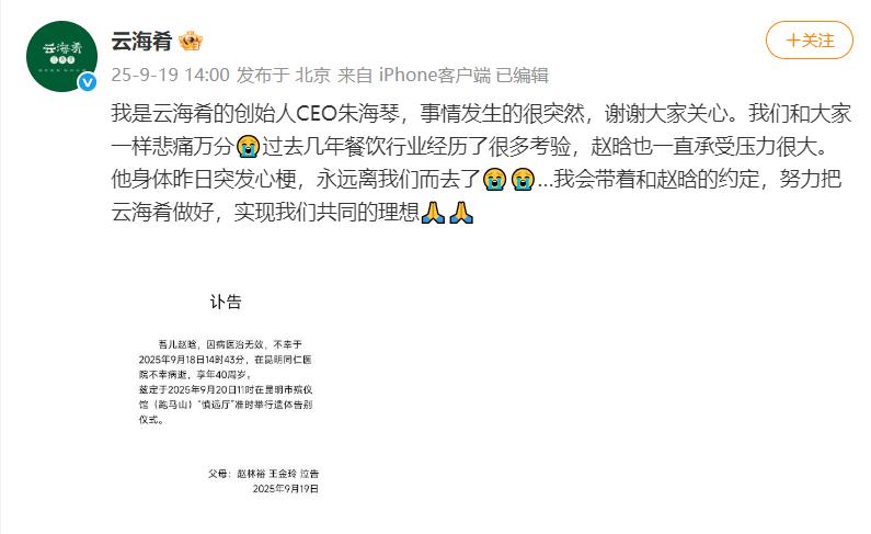 大公快消讯 9月19日,知名云南菜品牌“云海肴”联合创始人、董事长赵晗先生,因突发心梗去世的消息在餐饮界和创业圈传开,于2025年9月18日14时43分在昆明同仁医院医治无效不幸逝世,年仅40岁。