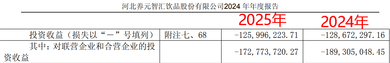 值得一提的是,养元饮品看似布局多元的投资策略,换来的确是接连的投资亏损。财务数据显示,2023年和2024年,公司投资净收益分别为-1.29亿元、-1.26亿元左右,其中对联营企业的投资收益连续两年亏损超1.7亿元。