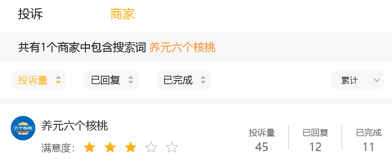 据黑猫投诉平台显示,截至2025年10月4日,关于“六个核桃”的投诉量为45条,但已回复量与已完成量分别为12条、11条。问题集中于食品变质、异物掺杂、售后推诿等核心痛点。