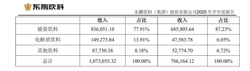 具体来看,2022年至2024年,东鹏特饮收入在公司营收中的占比分别为96.6%、91.9%、84%。2025年上半年,东鹏特饮营收约83.61亿元,占总营收的77.91%,虽较此前有所下降,但仍是绝对支柱。