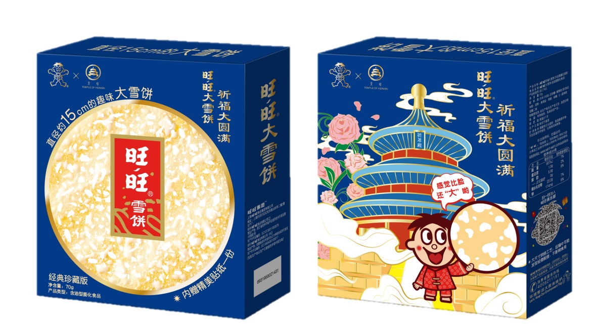 据悉,天坛始建于明永乐十八年,作为祈求五谷丰登、国泰民安的圣地,其祈福文化早已深入人心;“人旺,气旺,身体旺,财旺,福旺,运道旺”传递吉祥寓意。双方以“祈福大圆满”为合作主题,将天坛的文化厚重感与旺旺的国民亲和力完美结合,大雪饼在包装设计上融入了天坛的经典元素,结合传统吉祥元素,让传统文化深入消费者。