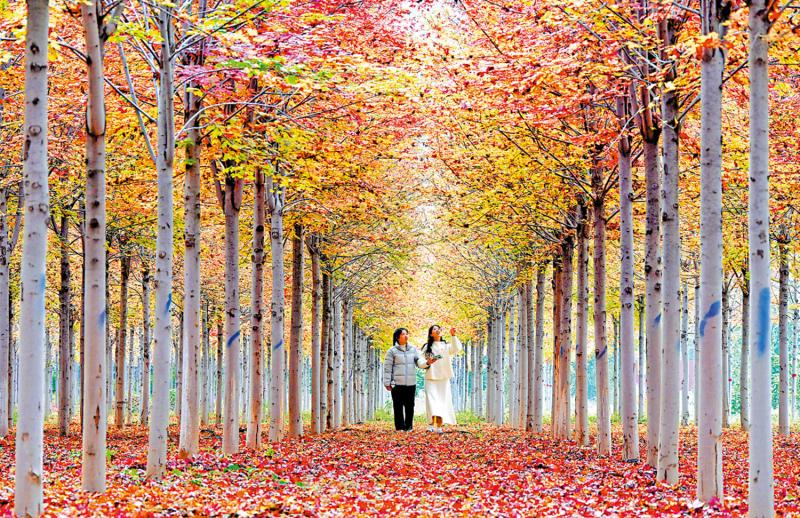 图:秋色愈浓,美不胜收。图为近日,游客在河北省邯郸市峰峰矿区义井镇万亩秀林游玩。\新华社