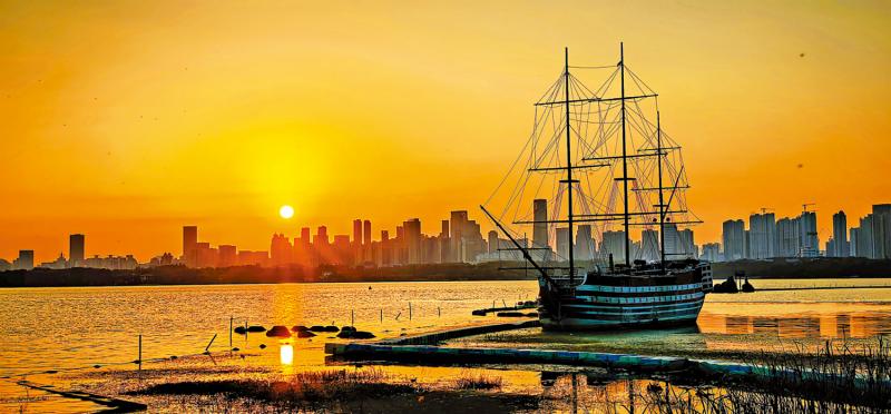 图:湖北省武汉市的东湖风景区在夕阳和晚霞的映衬下,壮美如画。\新华社