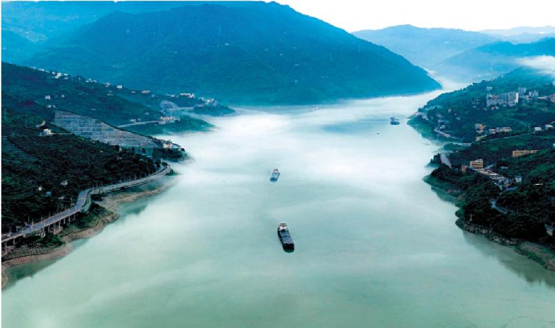 图:湖北省巴东县长江江面被云雾笼罩,船行其间若隐若现。\中新社