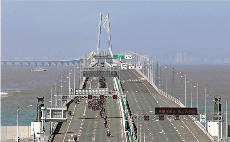 图:十一月八日,第十五届全国运动会公路自行车男子个人赛参赛选手在港珠澳大桥上骑行。 \新华社