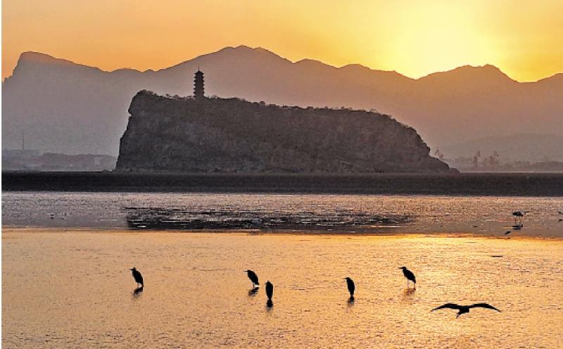 图:候鸟在江西省湖口县鄱阳湖鞋山水域栖息。/新华社