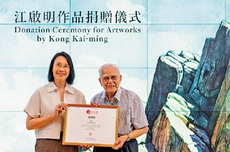 【大公报讯】香港艺术馆近日再喜获香港艺术的重要捐赠。香港著名艺术家江启明捐赠100幅描绘香港自然景观和地质面貌的水彩画作予香港艺术馆作永久馆藏。这批作品展现了江启明对大自然的细腻观察和刻画,以及他对香港的深厚感情。康乐及文化事务署署长陈咏雯代表署方向江启明致送感谢状。