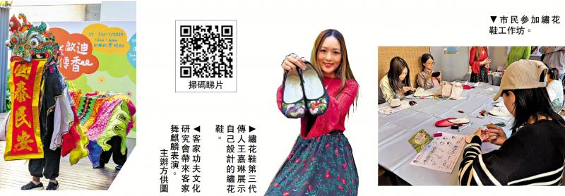 左图:客家功夫文化研究会带来客家舞麒麟表演。/主办方供图 中图:绣花鞋第三代传人王嘉琳展示自己设计的绣花鞋。左图:市民参加绣花鞋工作坊。