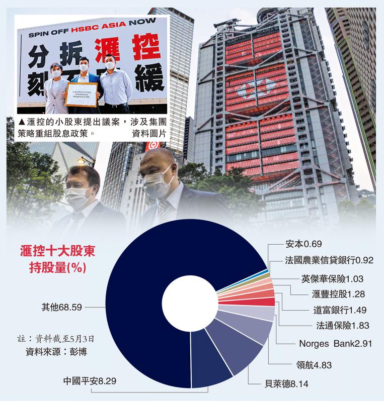 由香港小股东代表提出的第17项和第18项决议案,分别涉及滙控集团的策略重组(包括重整亚洲业务),及其股息政策。 滙控最大单一股东、持有大约8.3%股权的中国平安(02318)早前公开表示,经过仔细研究,平安原则上支持这两项议案,“认为有一定的可取之处,希望汇丰以开放的态度听取、研究股东意见”。