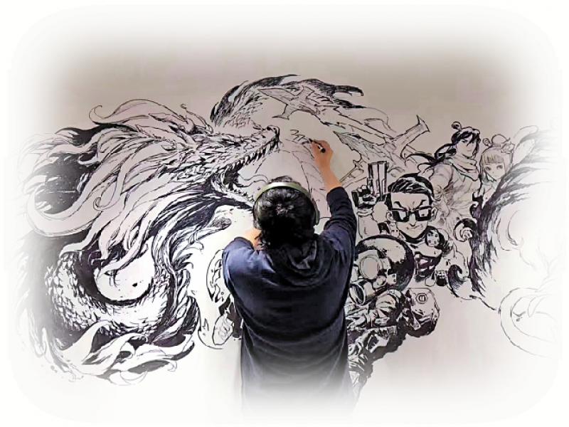 图:风行漫画总策划韩锋在公司文化墙上手绘《锁龙》。
