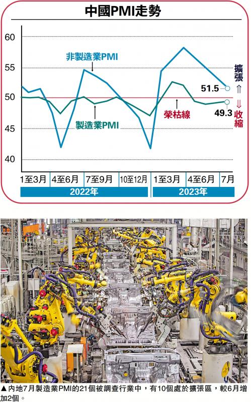 图:内地7月制造业PMI的21个被调查行业中,有10个处于扩张区,较6月增加2个。