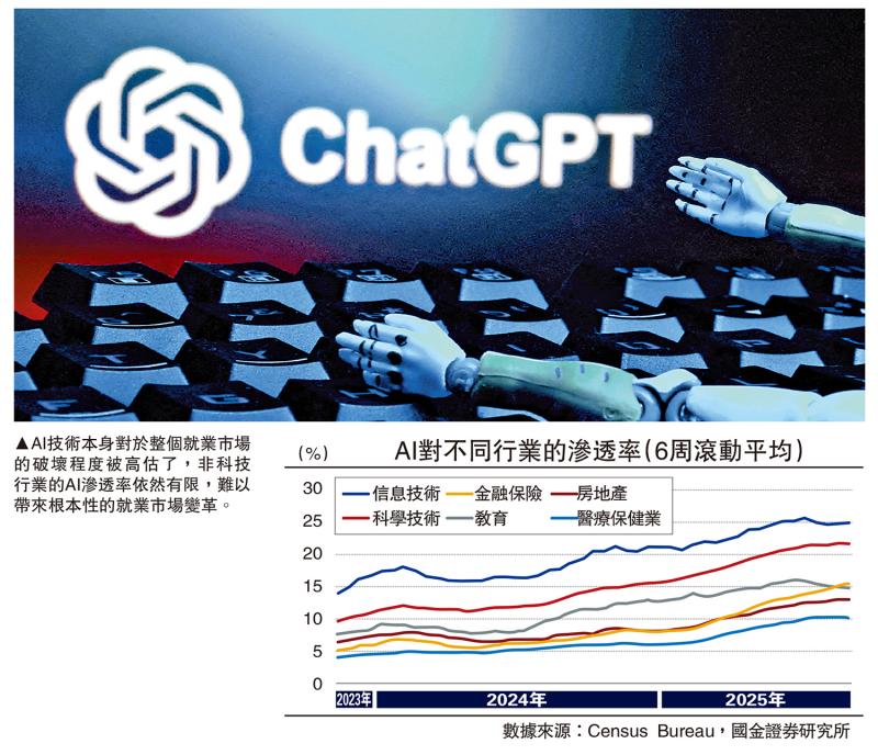 AI迄今为止对就业冲击有限的另一个证据是依然较低的渗透率。从行业视角看,在二十馀个大类行业中仅有六个的整体渗透率突破10%,其中信息技术业渗透率最高,渗透率约为25%。