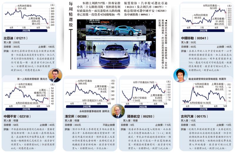 恒指上周跌717点,但专家指中共二十大即将召开,预料将有利好政策出台,而且港股再大跌的机会已很微,投资者可伺机吸纳一些优质股份;汽车股可选比亚迪(01211)及吉利汽车(00175),收息股则可选中国平安(02318)及中国移动(00941)。