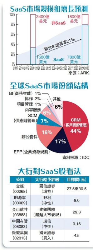 大约十年前,大多数市场都怀疑SaaS(软件即服务)业务能否盈利,到了2015年左右,市场逐渐看到SaaS业务开始盈利的证据,其后SaaS股的价值也被广泛地重新给予更高评估。到了疫情爆发后,企业的线上需求增加,SaaS服务的需求更出现爆炸性增长。女股神Cathie Wood更曾表示,未来十年将是SaaS的黄金时代,以逾两成的年复合增长率增长至2030年7800亿美元的规模,同时将不断蚕食传统软件市场。\大公报记者 许 临