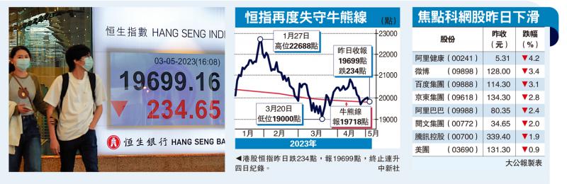 在经济衰退阴霾下,美股三大指数回吐超过1%,拖累港股走低;恒指跌幅一度扩大至395点,收市时跌幅缩窄至234点,报19699点,终止连升四日纪录,兼且跌穿250天牛熊分界线(昨日处于19718点)。科技指数下跌63点,收报3835点。港股通机制暂停,淡友主导大市,全日下跌股份多达1040只,上升股份只有440只。