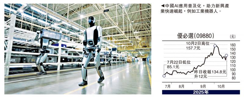 事实上,中国生成式AI用户数量呈爆发式上升,截至2025年6月,生成式AI用户规模达5.15亿人,较2024年12月增长2.66亿人,而且调查发现九成用户都是首选国产大模型。因此,中国AI应用普及化,助力新兴产业如工业机器人快速崛起。今年前三季中国工业机器人、服务机器人等产品产量分别增长29.8%及16.3%。近月人形机器人股持续吸引资金吸纳,其中优必选(09880)Walker系列人形机器人年内已获逾6.3亿元订单,刺激股价昨日大升约9%。