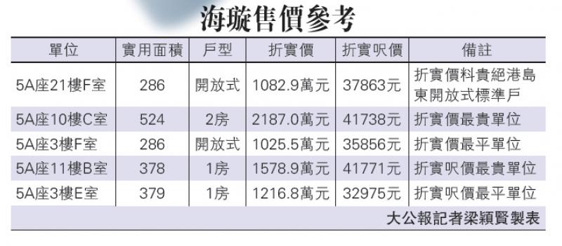 新地代理总经理陈汉麟表示,海璇今批单位全部位於5A座,包括16伙开放式、48伙一房及七伙两房,价单市值近12亿元,定价最平为5A座3楼F室,实用286方呎,开放式户型,定价1265.5万元,折实1025.05万元,折实呎价35841元,意味所有开放式全部超过1000万元。呎价最平为5A座3楼E室,实用369方呎,一房间隔,定价1502.2万元,折实1216.78万元,折实呎价32975元。另据价单显示,5A座11楼B室,实用378方呎,一房间隔,折实1578.9万元,预料是港岛东最贵一房户。