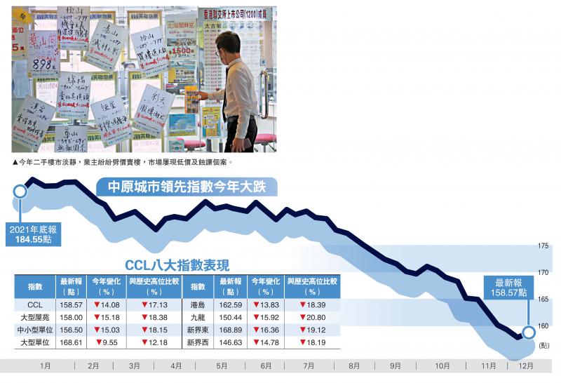 由于息率抽升,银行定存吸引,投资者“买砖头”意欲大减,今年下半年二手交投更疏落,7月份起连续5个月徘徊2000宗水平,期内楼价指数跌幅持续扩大,CCL于9月份跌穿170点关口,11月更失守160点,上周最新报158.57点,年内累跌逾14%,对比去年8月高位191.34点,已蒸发17.1%。