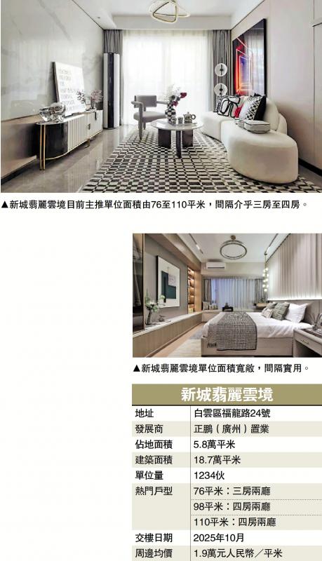位于广州白云区北部的锺落潭板块,近两年逐渐成为广州楼市的供应重镇,目前已吸引保利集团、珠江实业、越秀地产、旭辉控股、绿地集团、新城控股等发展商进驻,区内新盘主打中小户型,实用率高,受刚需客群追捧。其中,位处广州北核心区域的新城翡丽云境,周边的商业、教育、医疗、生态等配套基本齐全,参考均价每平米约1.9万元人民币(约2.05万港元),在广州楼市具有竞争力。\大公报记者 帅诚广州报道