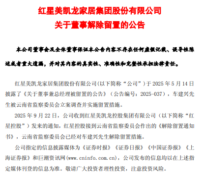 公告显示,于2025年9月22日,美凯龙收到红星美凯龙控股集团有限公司(以下简称“红星控股”)发来的通知,红星控股接到云南省监察委员会作出的《解除留置通知书》,云南省监察委员会已经对车建兴解除留置措施。