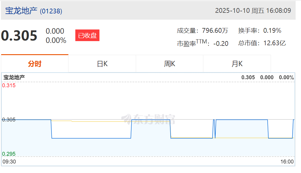 根据东方财富平台显示,截至10月10日收盘,宝龙地产股价为0.305港元/股,总市值降至12.63亿港元,市净率跌至0.04倍,每股收益-1.512港元。