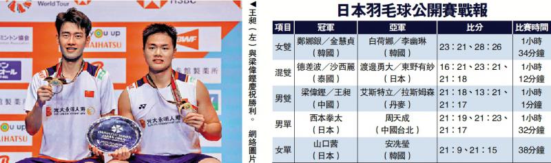 【大公报讯】日本羽毛球公开赛,中国队在男双赛事,凭梁伟铿/王昶在决赛击败丹麦艾斯特立/拉斯姆森组合夺得冠军。日本队的西本拳太、山口茜包办男女单冠军。韩国郑娜银/金慧贞组合,在女双决赛力挫同样来自韩国的白荷娜/李幽琳组合夺冠。混双冠军由泰国组合德差波/沙西丽夺得。